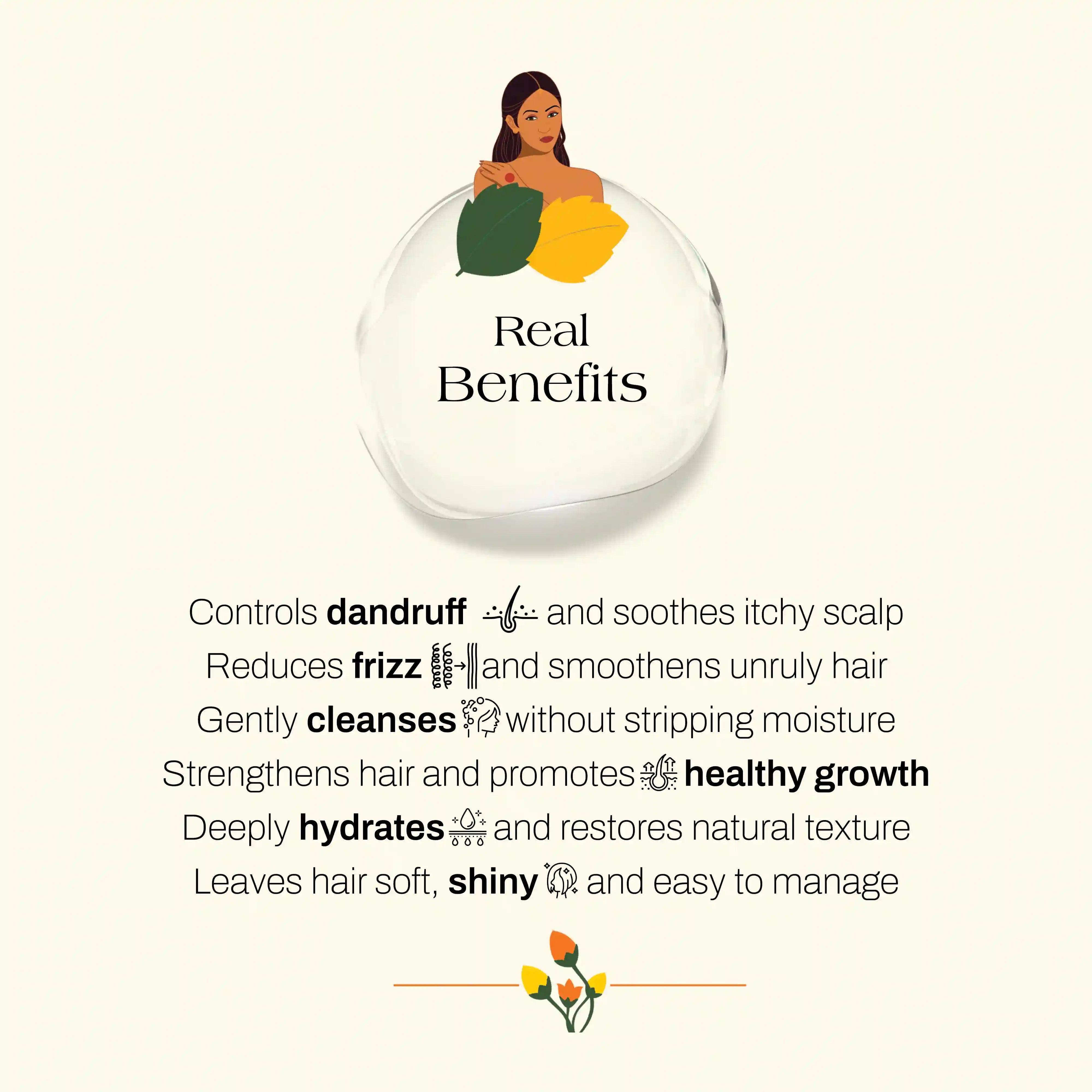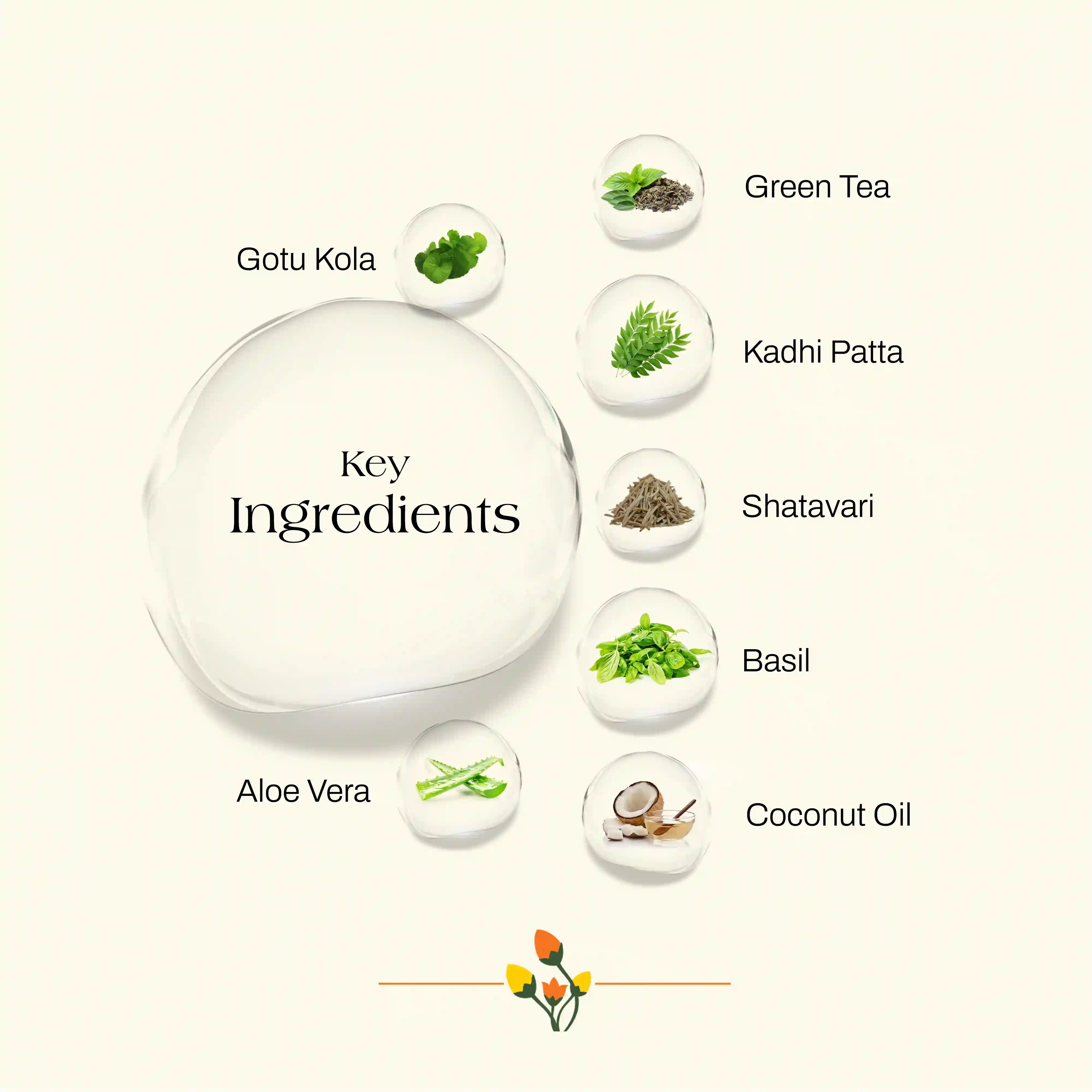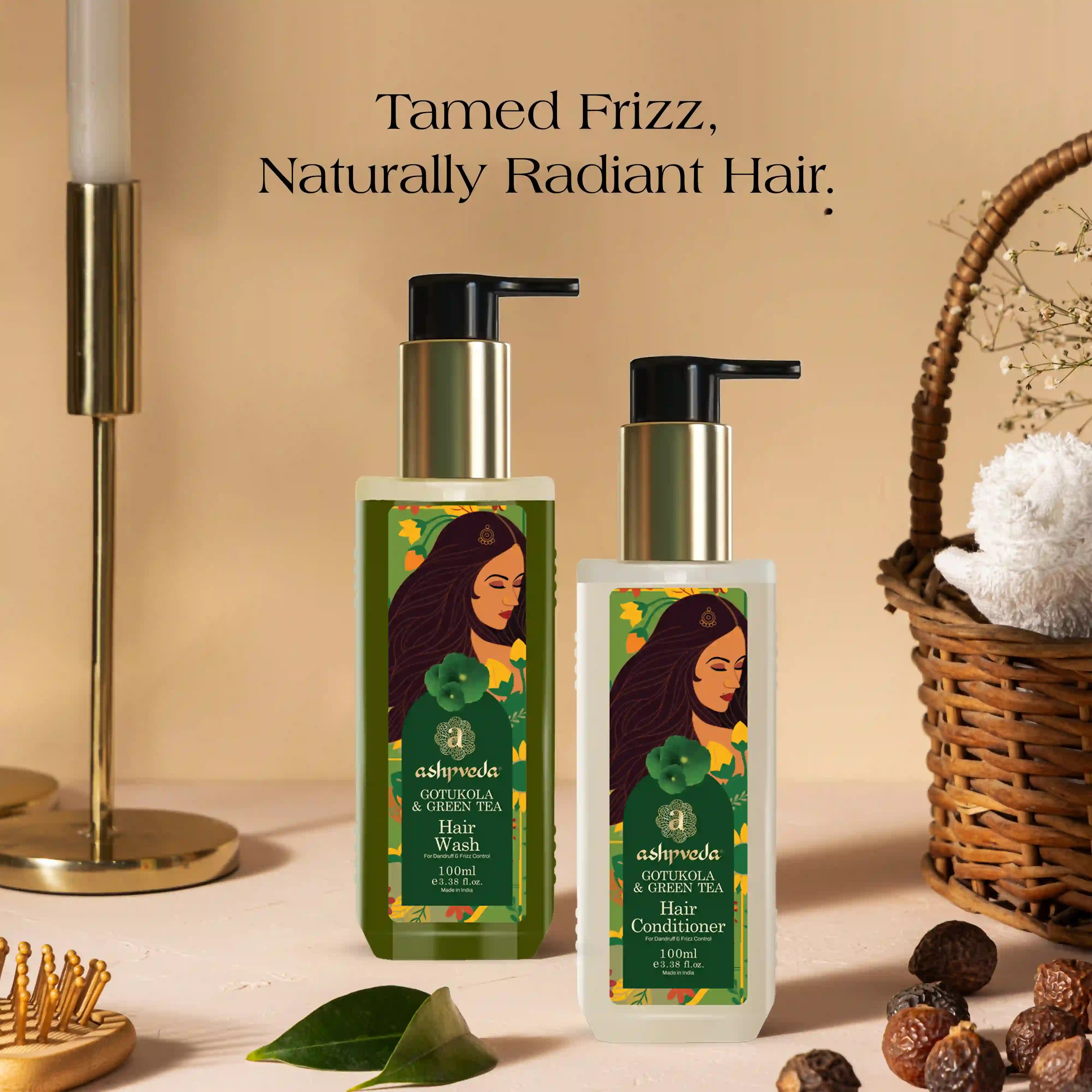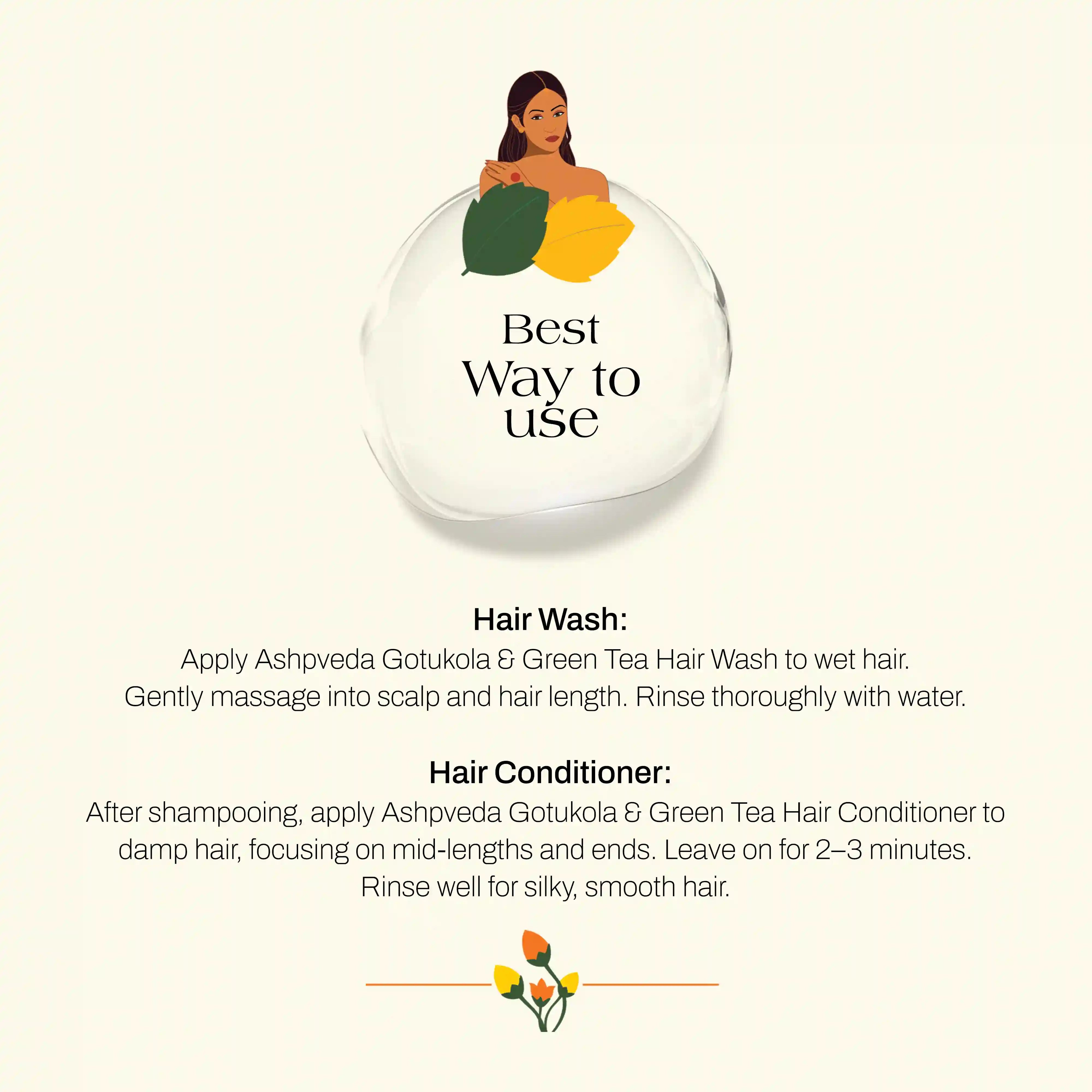 Ashpveda's Gotu Kola & Green Tea Hair Wash & Conditioner transforms your hair care routine by enhancing, managing frizz, and supporting overall hair health. Ashpveda Green Tea & Gotu Kola Shampoo also protects hair against UV damage and offers excellent anti-bacterial and anti-inflammatory properties. Ashpveda Green Tea & Gotu Kola Hair Conditioner contains powerful natural ingredients like basil essential oil, honey, and shikakai. It stimulates scalp blood circulation, regulates scalp oil production, promotes hair health, prevents hair thinning, nourishes the scalp, and moisturizes hair. Ashpveda Green Tea & Gotu Kola Conditioner also rebuilds, protects, strengthens, controls frizz, detangles hair, cleans hair without affecting natural hair pH, and prevents split ends.