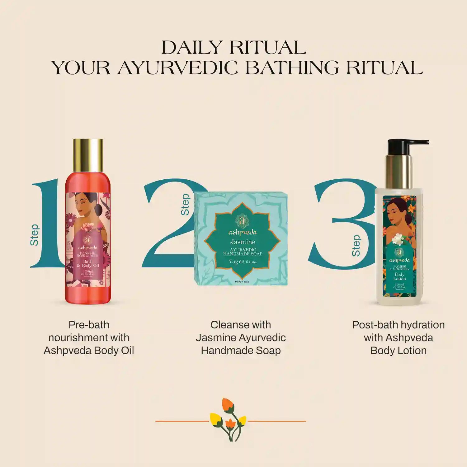 We use herbs, oils, and botanicals inspired by Ayurveda, sourced consciously, and crafted with safe, modern processes.